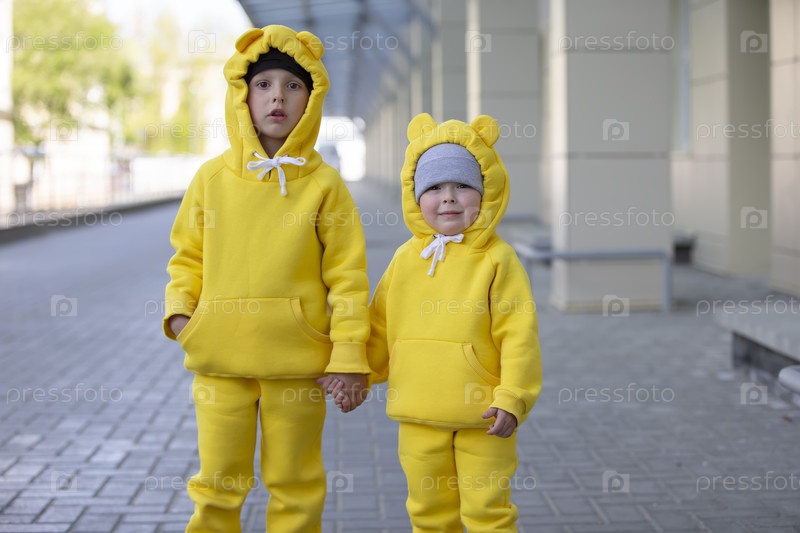 Маленький брат и сестра. Смешные дети, мальчик и девочка в желтых костюмах позируют, глядя в камеру