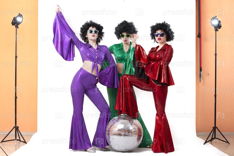 Группа девушек с диско-балом в красочных костюмах в фотостудии позирует на белом фоне
