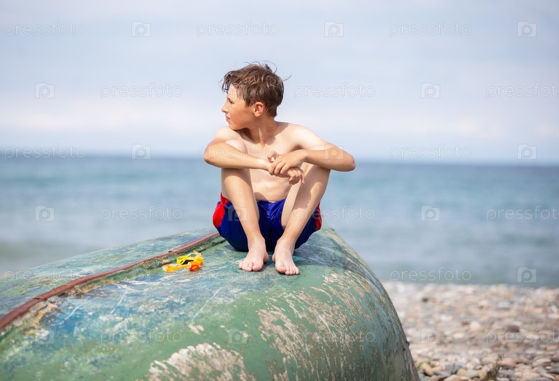 Мальчик на пляже сидит на старой лодке, выброшенной на берег штормом