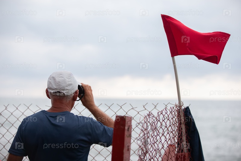 Спасатель смотрит в бинокль на море
