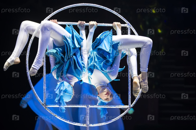 Две акробатки показывают цирковой номер на темном фоне. Акробатический спектакль