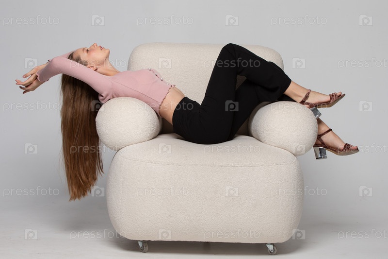 Красивая стройная девушка с длинными светлыми волосами лежит в удобном белом кресле. Женщина отдыхает и расслабляется в кресле