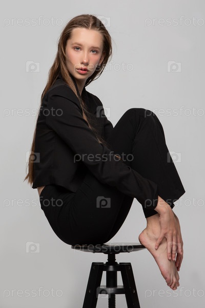 Тонкая красивая девочка-подросток в черном пиджаке сидела в красивой позе на студийном стуле. Блондинка-модель позирует