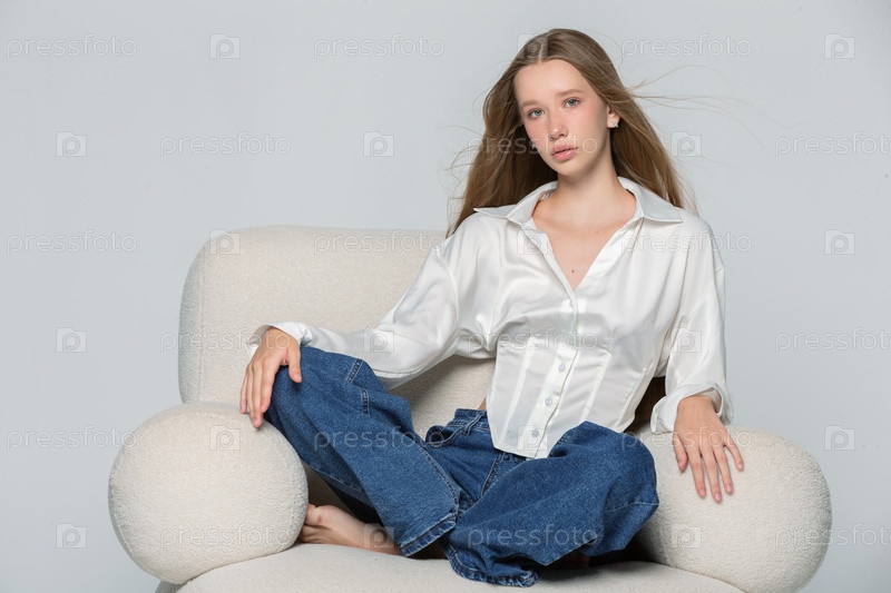 Красивая стройная девушка с длинными светлыми волосами в белой рубашке сидит в удобном мягком кресле