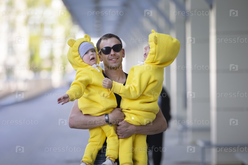 День отца. Счастливый папа держит на руках двух маленьких детей