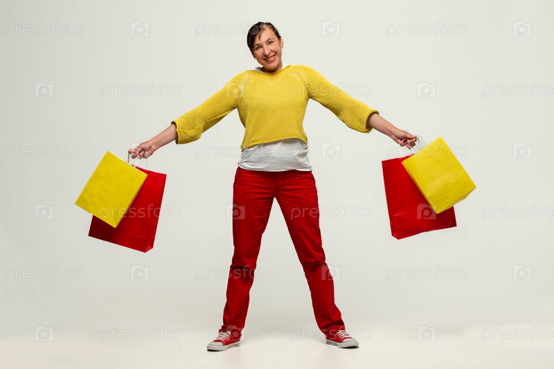Фотография положительной, веселой женщины, держащей подарочные сумки, наслаждающейся шопингом