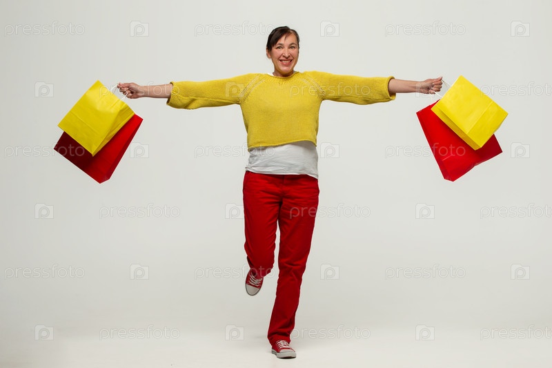 Полнометражная фотография позитивной, веселой женщины средних лет с сумками для покупок