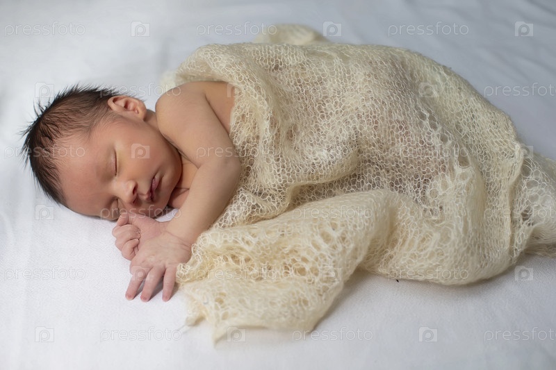 Новорожденный ребенок завернут в вязаное одеяло на светлом фоне
