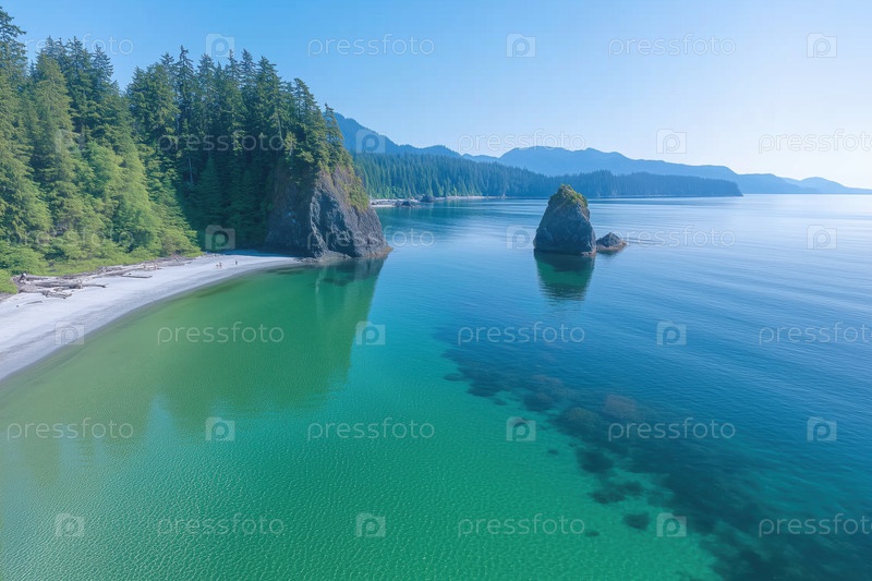 Вид с воздуха на побережье в тумане. Летний пейзаж
