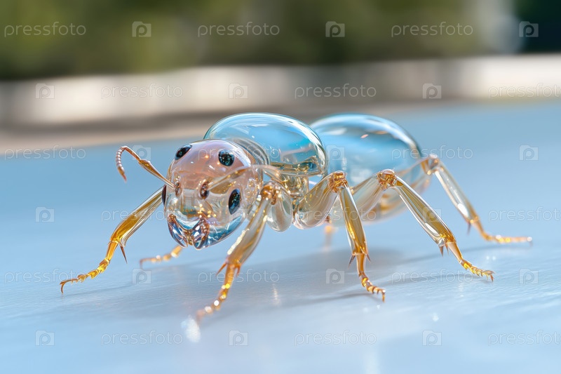 Закройте крошечного прозрачного муравья на синем фоне. Малая глубина резкости