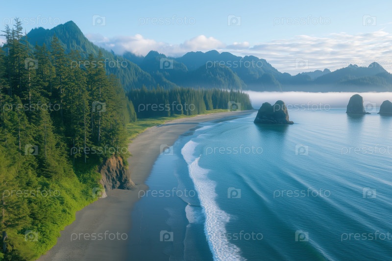 Вид с воздуха на красивый пляж утром с туманом