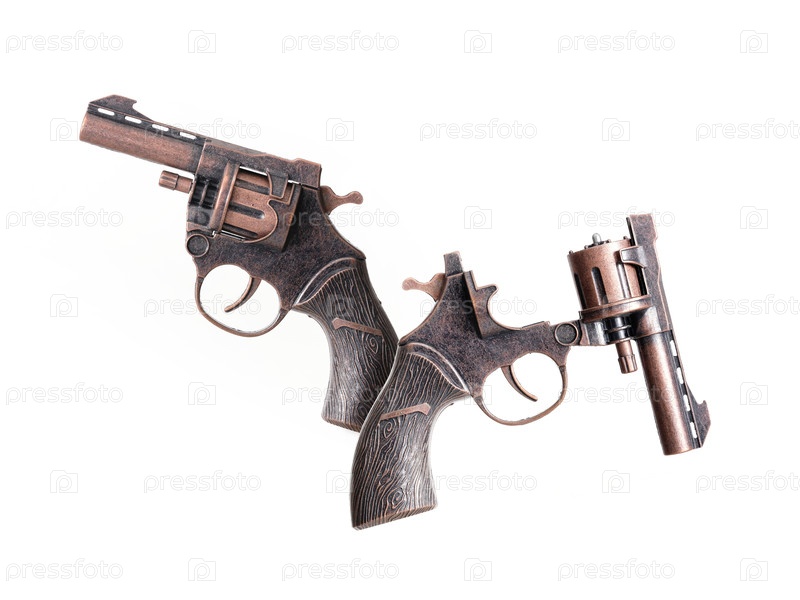 Детские игрушечные револьверы изолированы на белом фоне