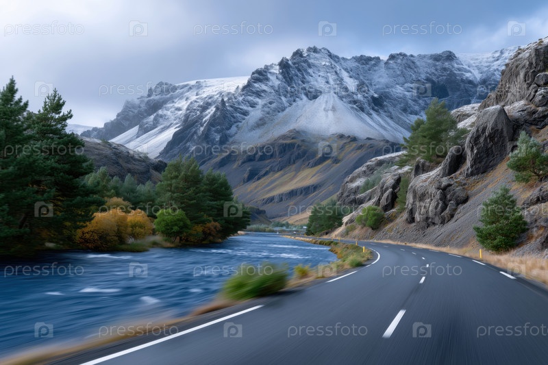 Езда по асфальтовой дороге в горной долине вдоль реки, движение размыто