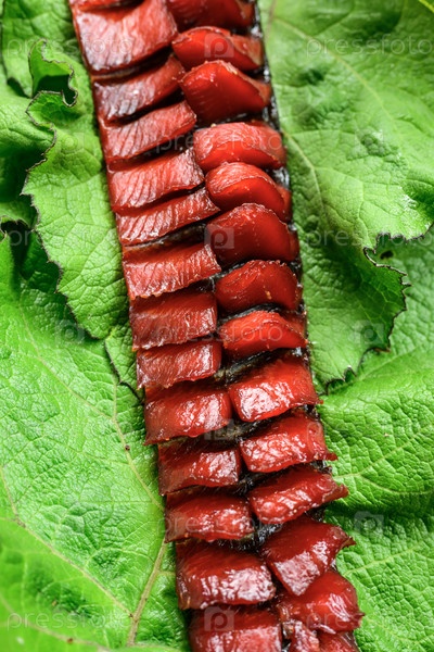 Рыба юкола на зеленых листьях