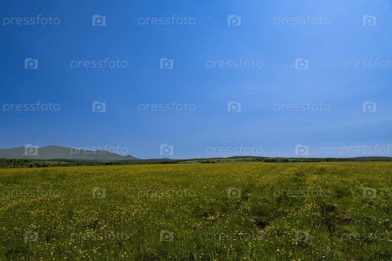 Поле желтых цветов под голубым небом