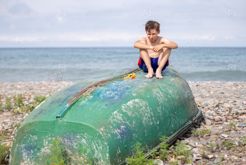 Мальчик на пляже сидит на старой лодке, выброшенной на берег штормом