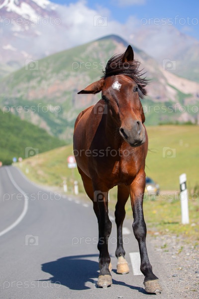 Лошадь идет по дорожке в горной местности и машет головой