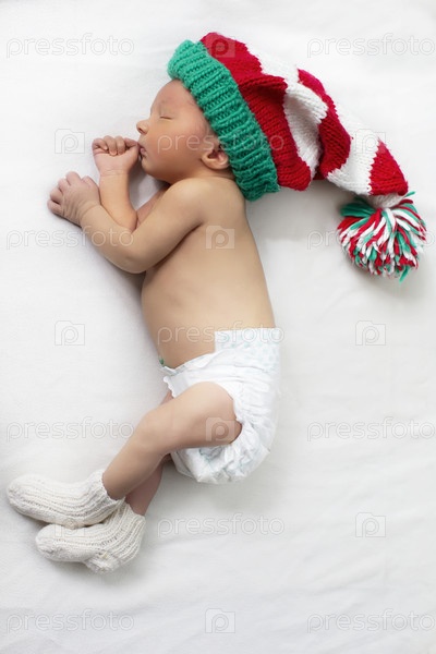Новорожденный ребенок в рождественской вязаной шляпе гнома