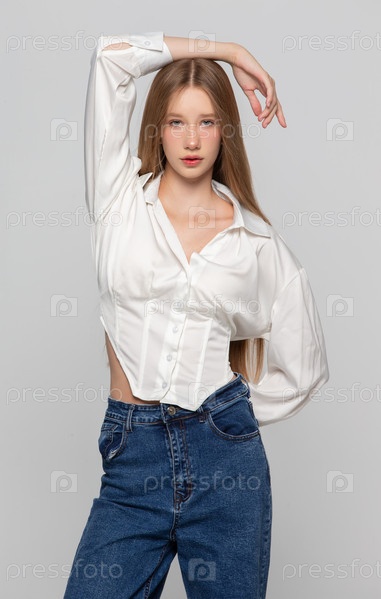 Портрет красивой блондинки с длинными волосами. Она позирует для камеры в белой рубашке и джинсах