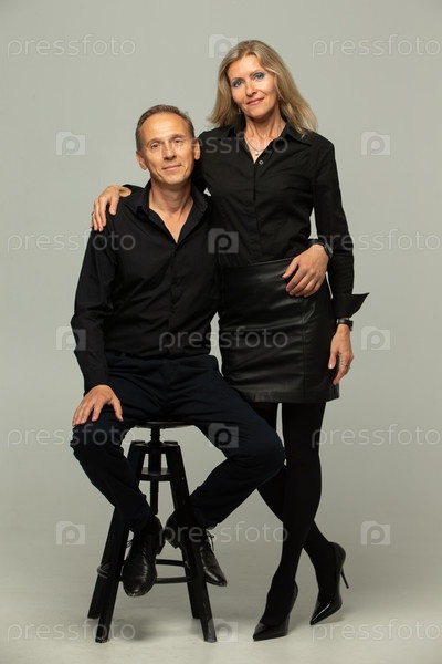 Портрет зрелой пары. Пара, двое друзей пожилой седой мужчина и блондинка в черной одежде позируют