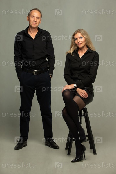 Портрет зрелой пары. Пара, двое друзей пожилой седой мужчина и блондинка в черной одежде позируют