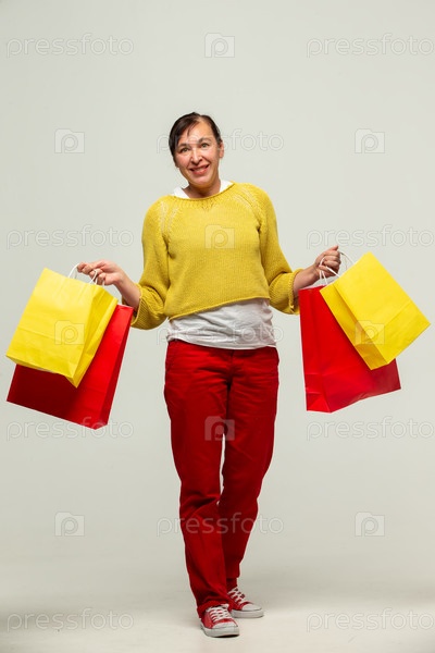 Фотография положительной, веселой женщины, держащей подарочные сумки, наслаждающейся шопингом