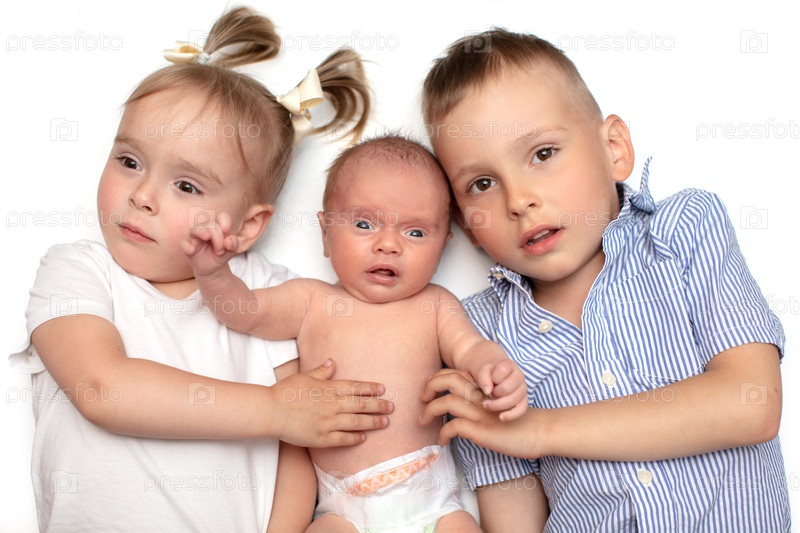 Брат и сестра лежат вместе с новорожденным ребенком. Трое маленьких детей разного возраста. Дети в семье