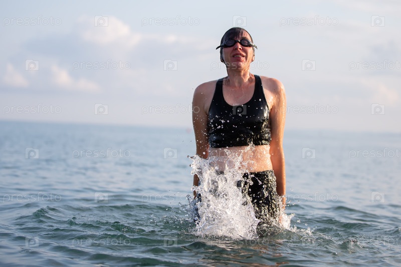 Женщина-пловец выпрыгивает из морской воды с потоковыми брызгами