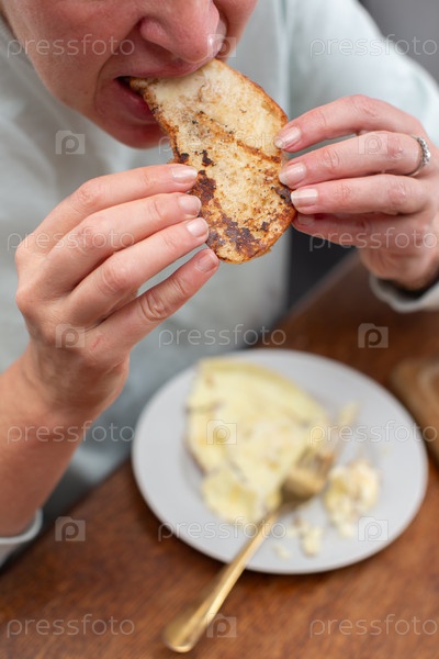 Руки женщины держат поджаренный тост. Ешь еду