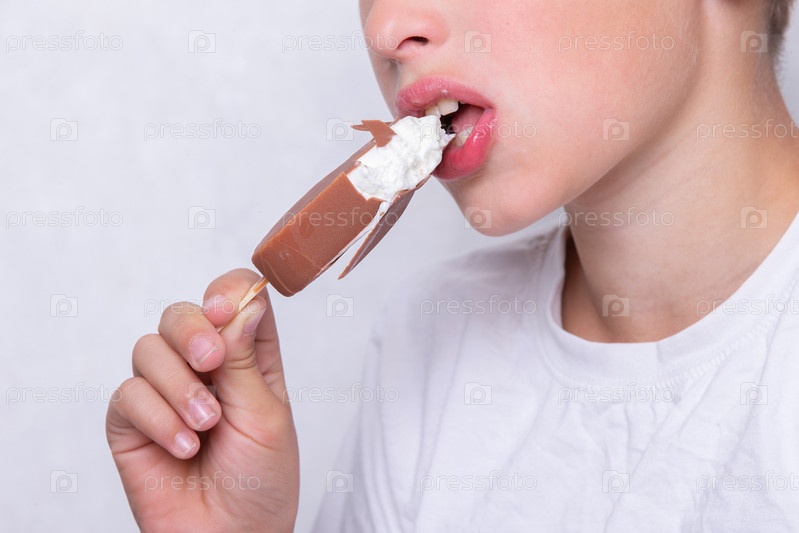 Мальчик, чье лицо неузнаваемо, ест мороженое, покрытое шоколадом