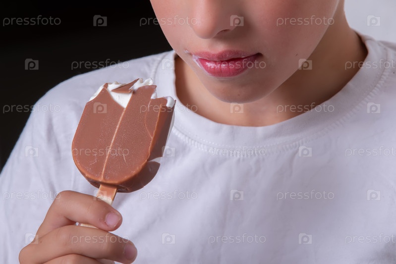 Мальчик, чье лицо неузнаваемо, ест мороженое, покрытое шоколадом