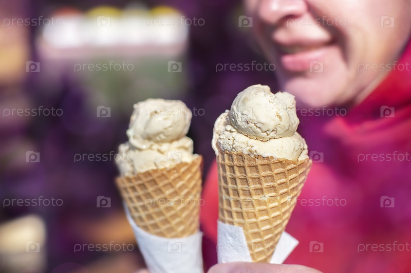 Кремовое мороженое в вафельной чашке на фоне размытого человека и фиолетовых пятен боке