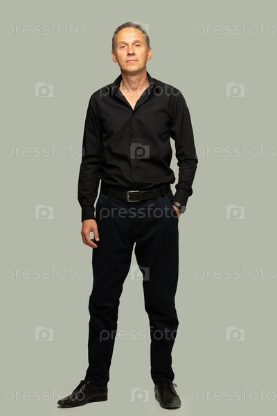 Красивый пожилой мужчина в черной одежде на сером фоне в полном росте