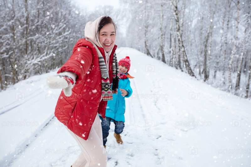 Женщина средних лет на фоне зимнего пейзажа и размытый мальчик. Она протягивает руку и приглашает на зимнюю прогулку