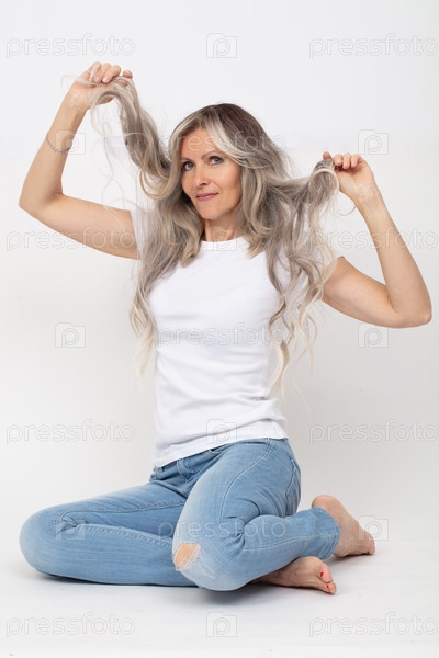 Красивая взрослая женщина с длинными седыми волосами позирует на сером фоне