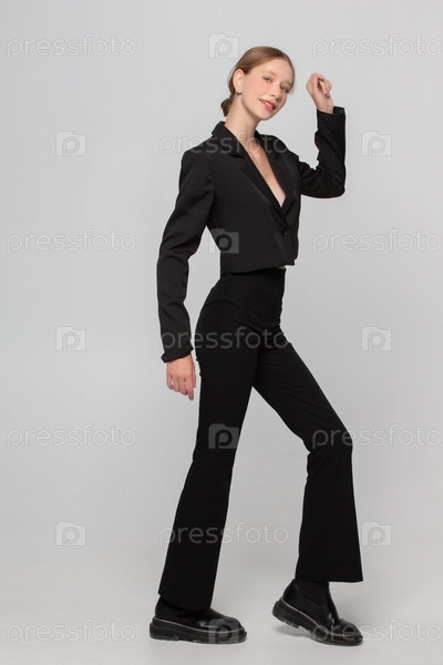 Красивая модель в классическом черном костюме делает шаг вперед. Вертикальная фотография красавицы на сером фоне
