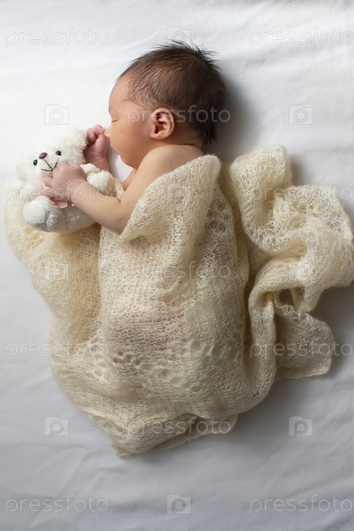 Новорожденный ребенок завернут в вязаное одеяло на светлом фоне