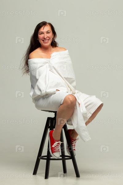 Красивая женщина средних лет, завернутая в белый лист, позирует на студийном стуле