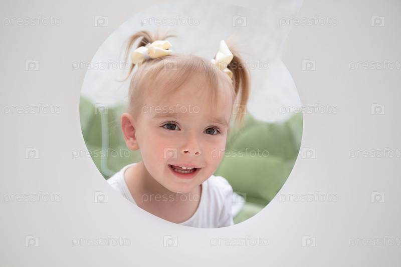 Лицо забавной девочки, которая смотрит в дырку из бумаги
