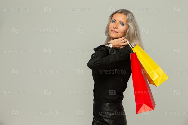 Пожилая седая женщина с магазинами, подарочные сумки изолированы на сером фоне