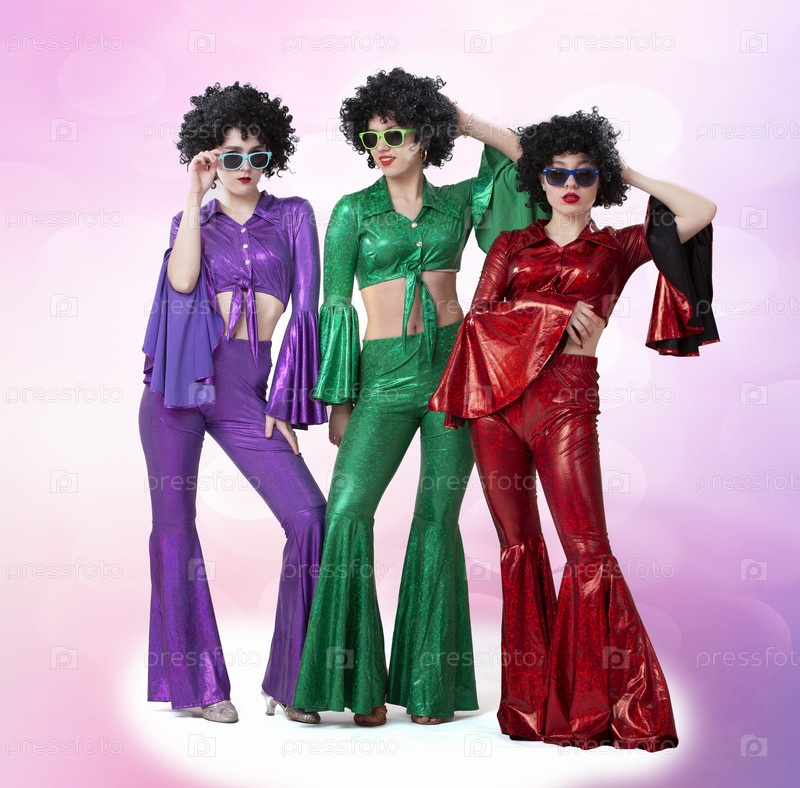 Группа девушек в стиле диско и африканские парики в красочных костюмах на розовом фоне. Певцы и танцоры восьмидесятых и семидесятых годов