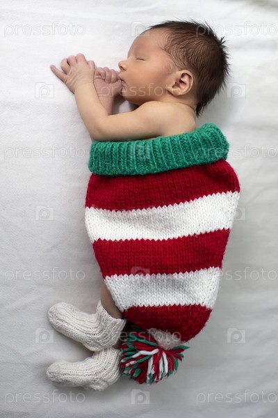 Новорожденный ребенок в рождественской вязаной шляпе гнома