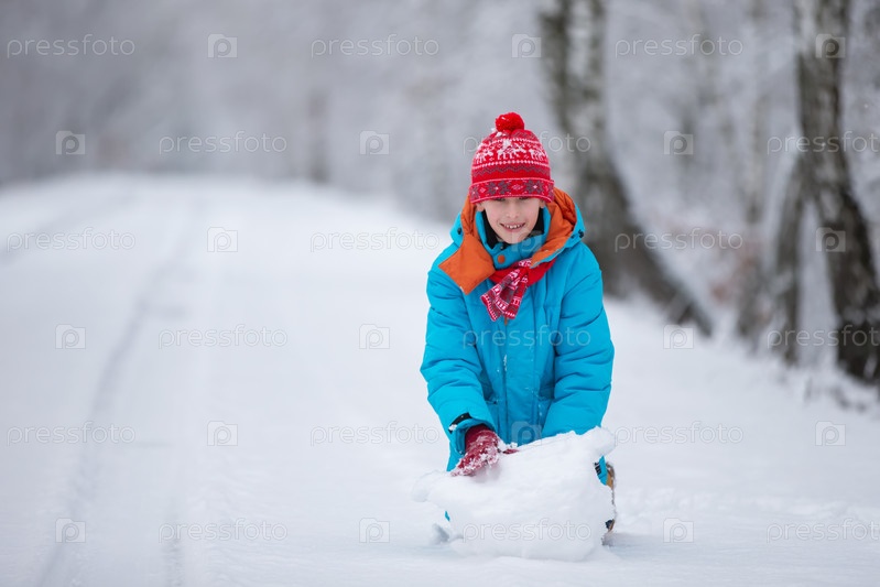 Счастливый мальчик с большим снежным шаром. Концепция счастливых зимних каникул