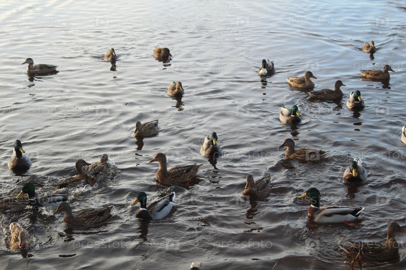 На озере плавает стая уток и дрейков. Утки на воде