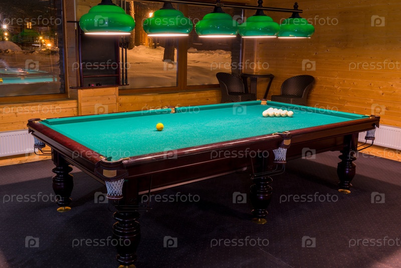 Спортивная игра в бильярд на зеленой ткани. Многоцветные бильярдные шары с цифрами на бильярдном столе