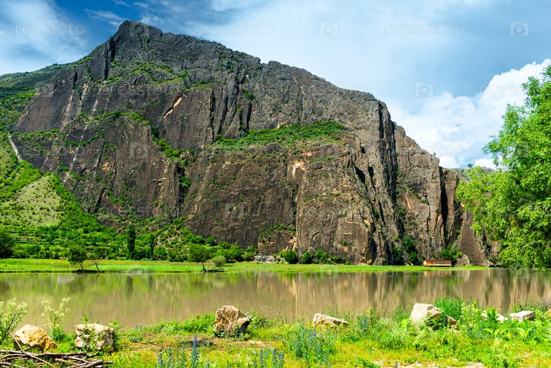 Драматический пейзаж живописной скалы на берегу спокойного горного озера в предштормовую погоду в Дагестанском нагорье. Северный Кавказ. Россия