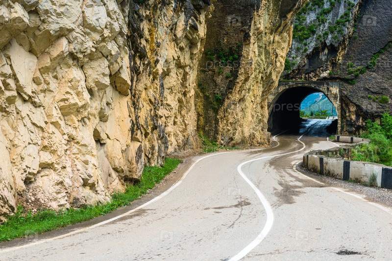 Горная асфальтовая дорога и тоннель в скалистой горе. Северный Кавказ