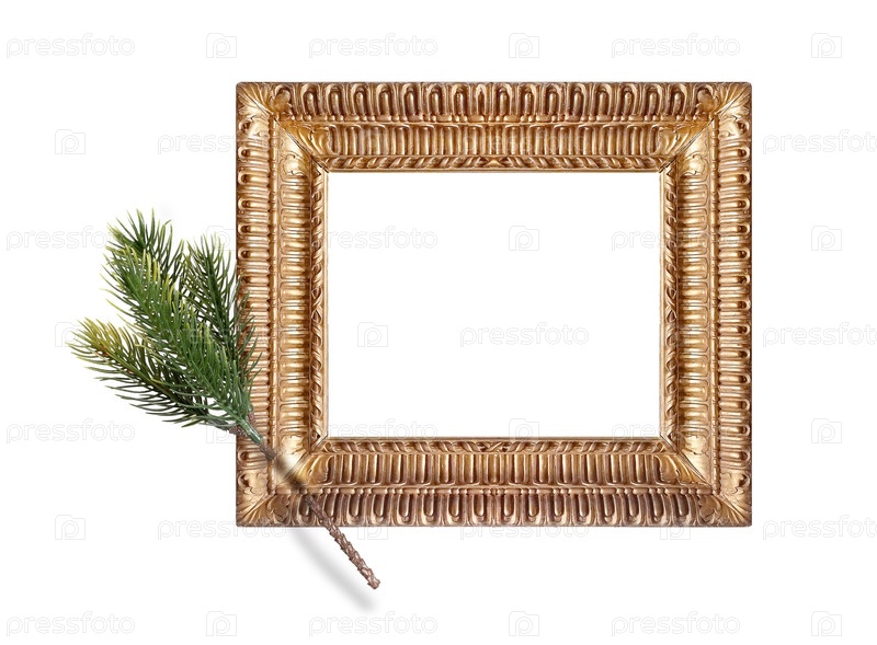 Золотая рама с рождественскими украшениями, изолированными на белом фоне