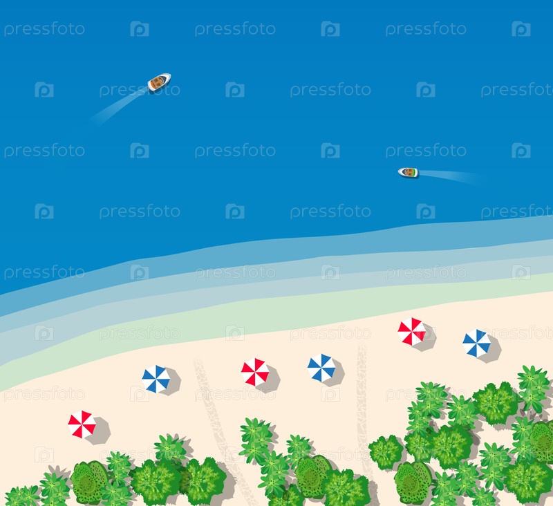 Летний отдых в отеле в океане с белым песчаным пляжем, бунгало и деревьями
