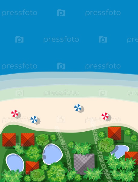 Летний отдых в отеле в океане с белым песчаным пляжем, бунгало и деревьями